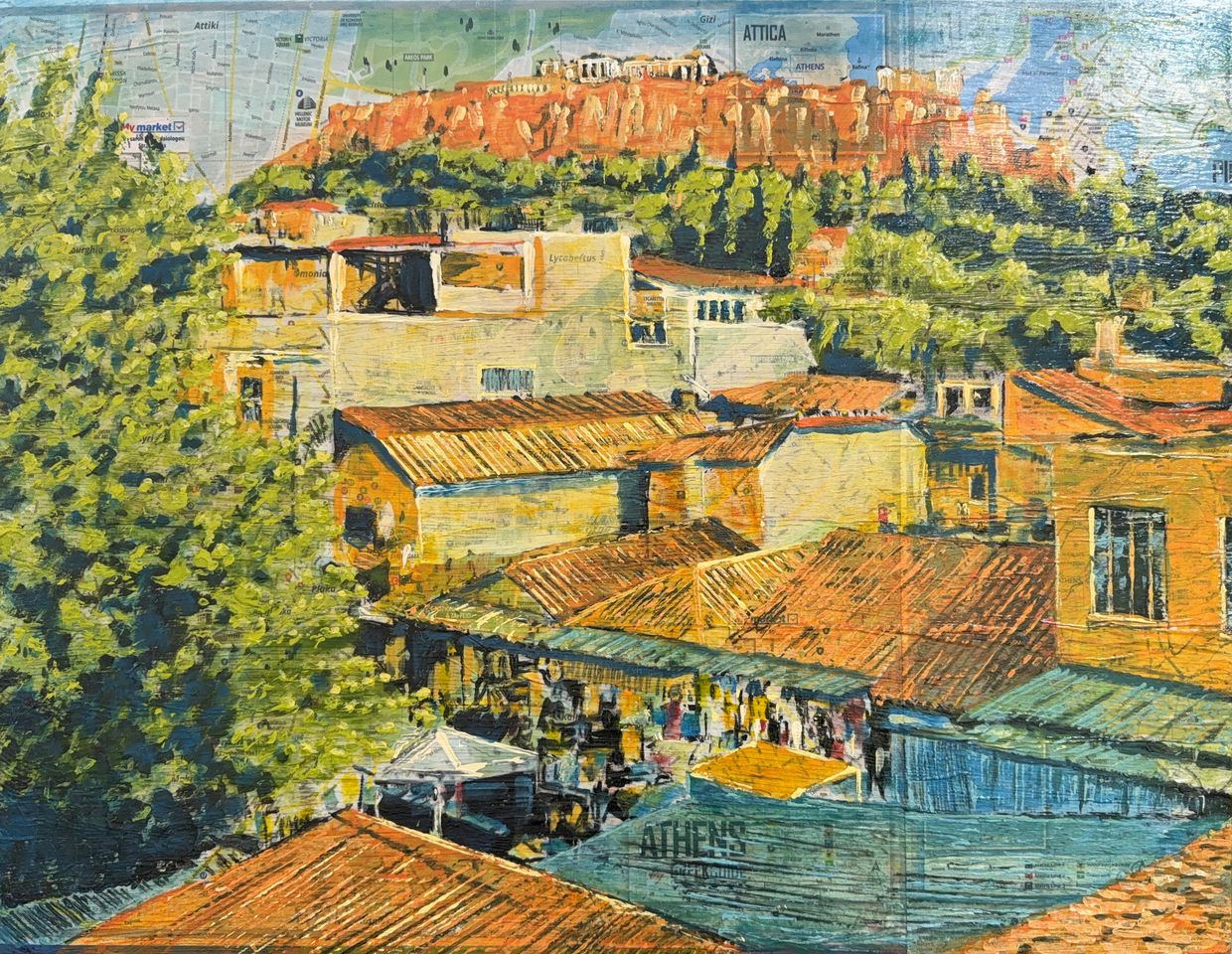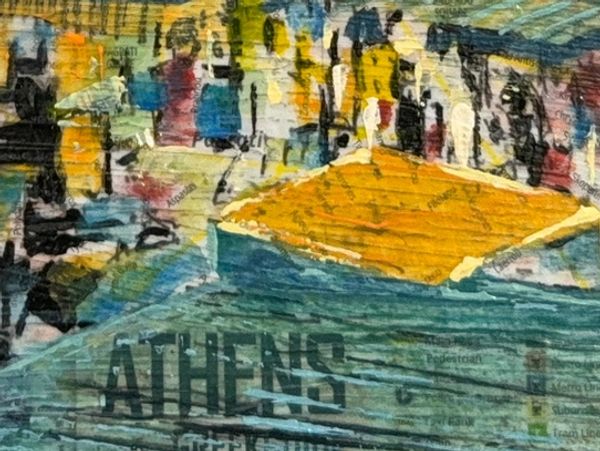 Painted on a map of Athens using a card from a local jeweler as a paintbrush.