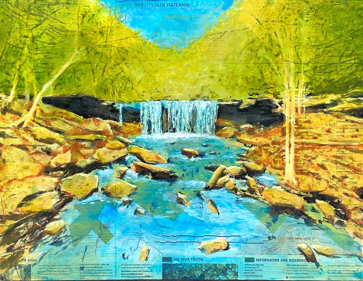 Painted on a Park Map of Ricketts Glen using a stone from the creek as a paintbrush.